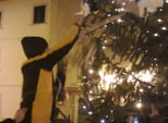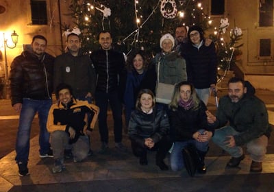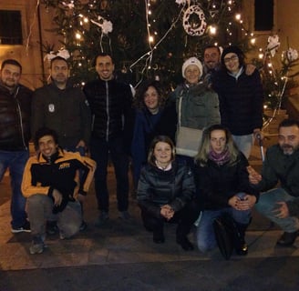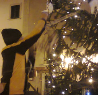 Tornando al periodo natalizio... continuano le sortite serali con il solito gruppo di amici e con l'immancabile foto di rito scattata proprio sotto l'albero di "Piazza". Per una festività (correva l'anno 2015), non si sa bene il motivo, l'albero non venne addobbato in maniera adeguata; allora ci pensammo noi: dopo una cena, in folto gruppo, andammo sparsi in giro per il pese a far bottino, fregando di tutto e di più... "attingendo" sia dagli usci delle case sia dalle vetrine esterne delle botteghe. Darietto fu lesto ad arrampicarsi e addobbare il nostro albero di "Piazza" mentre a turno gli passavamo la merce recuperata: palline, stelle filanti, luci a led... e tanto altro...; qualche furbetto, però, pensò bene di farmi uno scherzetto prendendo anche qualche addobbo che mia mamma aveva sistemato nell'andito di casa: vidi spuntare sull'albero la mia bella ghirlanda appesa ad una altezza tale che non potessi ormai più recuperarla! Ma che bravi ragazzi...!