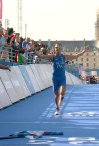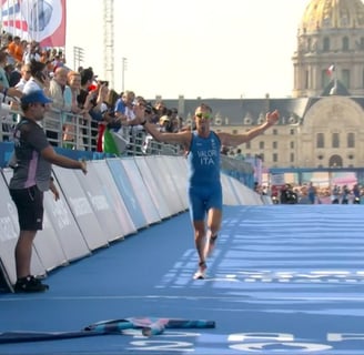E finalmente, dopo tanto lottare, giunge la mattina del 2 settembre, anche se la gara era stata programma per il 1 ma spostata al giorno successivo perché i parametri di inquinamento della Senna erano alti! Quindi tutti piazzati al bar nel "Borgo" davanti la televisione in strada posizionata appositamente per la gara. Non erano mancati, però, sms a Chino da parte di tutti gli amici.. sostenendolo e incoraggiandolo. Gianluca parte con la disciplina del nuoto ma, purtroppo, subisce subito un "incidente" che lo condizionerà durante il percorso: nuotando lungo un muro, un gancio gli trincia una parte della tutta! Continua con tenacia le altre due discipline ed eccola là... all'arrivo... a braccia aperte... a esprimere tutta la sua felicità per aver terminato la sua gara a "cinque cerchi" posizionandosi con onore all'ottavo posto con un tempo di 1h 19' 39''; una prova che si è svolta su distanza Sprint di 750 metri di nuoto, 20 chilometri in bicicletta e 5 chilometri di corsa.