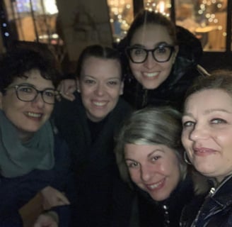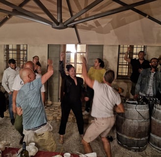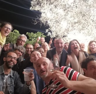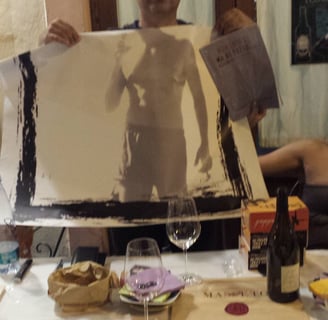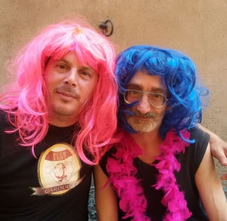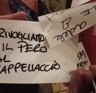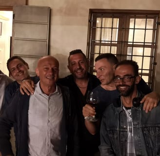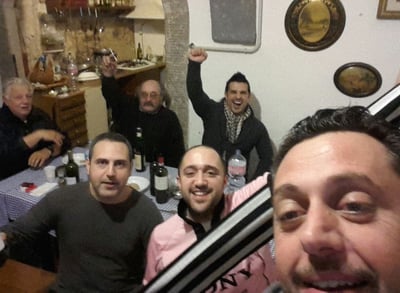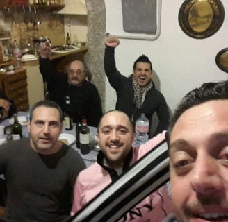 L'apice delle serate, però, è stato toccato per il cenone di "San Silvestro" 2024, quando, ad una cert'ora, già tutti belli altezzosi, ci rendemmo conto di aver finito le nostre scorte personali di alcolici: vino e bollicine; a quel punto si dovette ricorrere ad uno stratagemma. Ognuno di noi, all'inizio della serata, aveva portato e regalato alla proprietaria Sonia delle bottiglie che lei, ingenuamente, aveva lasciato in bella vista sia nel frigo che in giro per il locale; a quel punto... non ci rimase altro che fargliele sparite tutte...: - Non c'è l'ha mai perdonata!!! Tutt'oggi ci rinfaccia l'accaduto! Purtroppo la serata fu un po' "raffreddata" dalla brutta caduta che fece Eli, compagna di Marce - ancora non è chiara la dinamica - riuscendo a slogarsi, in una sola volta, entrambe le caviglie! Si narra, simpaticamente parlando, che fosse leggermente alticcia... ma lei tutt'oggi nega...!!! Ma non finisce qui: l'indomani, Marce, preso dal fatto di essere in ritardo al consueto aperitivo serale nel "Borgo", scese la moglie in fretta e furia dalla macchina parcheggiata in discesa davanti al "Cappellaccio", adagiando poi la ragazza sulla carrozzina poiché ancora claudicante... ma, come se non bastasse, ingenuamente, lasciò andare la seggiola a rotelle!!! Fummo lesti ad urlargli e ad correrle incontro per bloccarla! Ahimè... se una ruota della carrozzina avesse "zeppatto" in una lastra del "Borgo"?! Meglio non pensarci... ma il "volo", a quel punto, sarebbe stato assicurato!