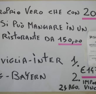 Una volta (correva l'anno 2020), sempre con Bebeto facemmo una scommessa goliardica e vincente: l'allenatore Conte aveva "lanciato" una delle sue tante "massime" dicendo che "con 10 euro era impossibile andare a mangiare in un ristorante stellato", affermazione che stava a giustificare il fatto che una squadra, investendo poco, non può certo sperare di raggiungere traguardi eccezionali. Allora decidemmo noi... di investire 10 euro a testa, vincendone poi circa 150, per aver scommesso su due finali: Champions e Europa League. Una finalista era proprio l'Inter... la rivale di sempre che perse la partita decisiva; a qual punto facemmo un cartello a mo' di scherzo che poi Bebeto pensò bene di postare su facebook: