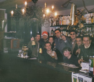 A fine serata, e naturalmente a termine bevute, spesso non mancava la classica rottura dei bicchierini: i più gettonati? Quelli da grappa! Questi, infatti, venivano picchiati, in maniera decisa, sulle lastre, in modo da attutirne il rumore; dopodiché c’era da far sparire “quello” che rimaneva del bicchiere, affondando il “culaccio” nel terriccio delle fioriere. Questa prassi si è tramandata fin quasi ai tempi attuali: alcuni “fondi” di bicchiere, forse, sopravvivono ancora dentro le fioriere: Leo, al tempo del “Deh Oh” (correva l’anno 2011), ne fu vittima e testimone oculare! Questo rituale fu poi ingigantito, ma solo per una sera, quando il Bar “Black&White” fu preso da Mapo (correva l’anno 2002); la sera dell’inaugurazione della nuova gestione capitò, per l’appunto, in concomitanza della nostra cena natalizia: furono prese d’assalto tazzine, bicchierini e piattini...